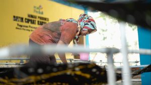 Misiyem, salah seorang pekerja difabel dari Rumah Produksi Batik Ciprat Karya Barokah melakukan proses produksi batik di workshop yang terletak di Desa Pucung, Kabupaten Wonogiri. FOTO DOK PLN