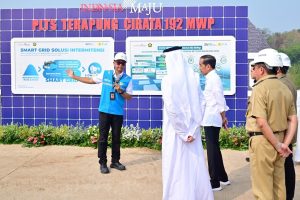 Presiden Republik Indonesia Joko Widodo (tiga dari kiri) mendengarkan paparan Direktur Utama PLN Darmawan Prasodjo (kiri) saat peresmian Pembangkit Listrik Tenaga Surya (PLTS) Terapung Cirata di Purwakarta, Jawa Barat, Kamis (9/11). Darmawan menjelaskan penggunaan teknologi smart grid sebagai solusi tantangan intermitensi pada pembangkit energi terbarukan seperti surya dan angin dalam akselerasi pengembangan energi terbarukan. Foto BPMI Setpres